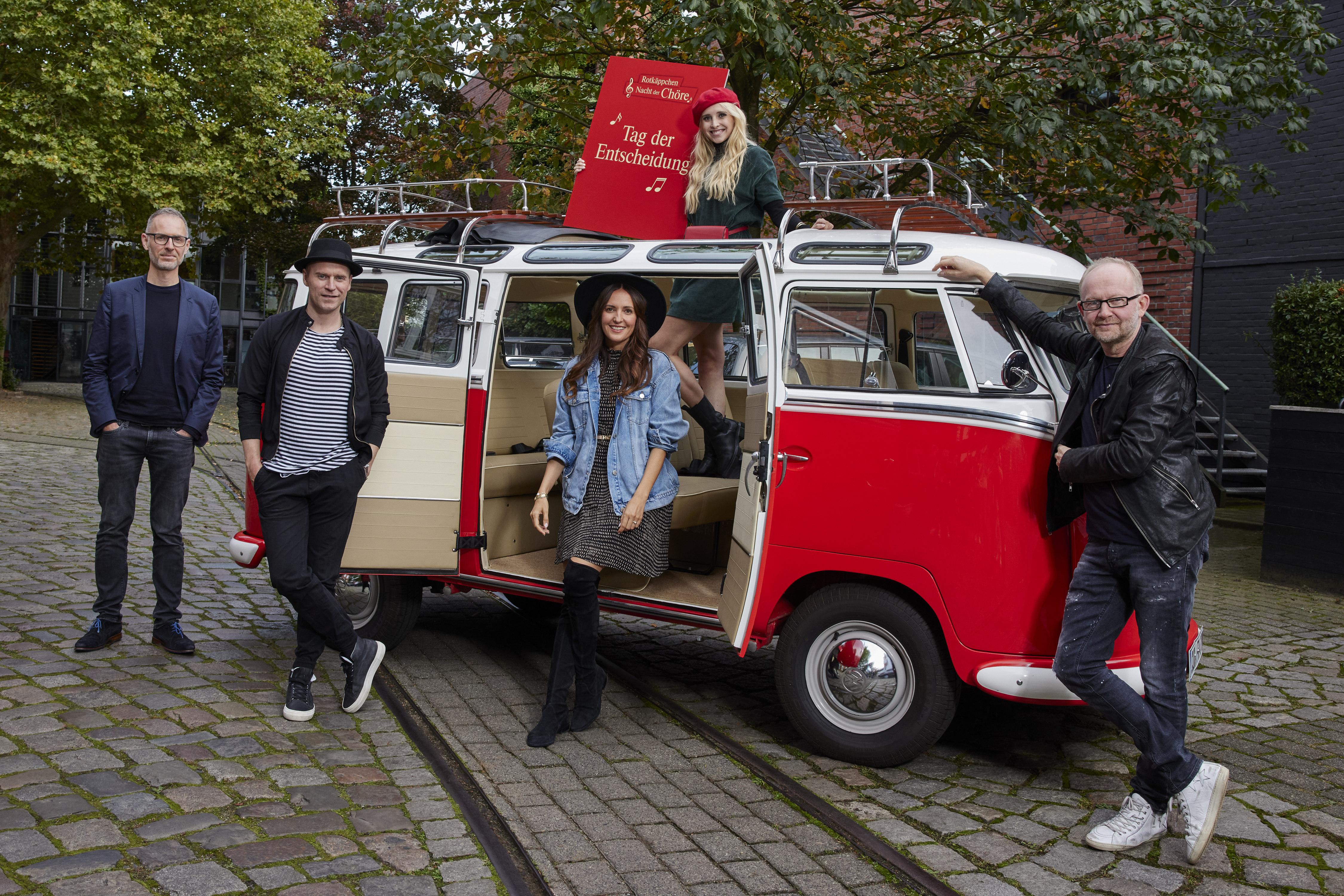 Die Jury der Rotkäppchen Nacht der Chöre hat sich entschieden, welche beiden Chöre gemeinsam mit Johannes Oerding performen: von links Tobias Richter, Marketing Manager von Rotkäppchen, Influencerin Marijke Smittenaar, Johannes Oerding, musikalischer Leiter Dieter Falk und Entertainment-Expertin Johanna Klum.