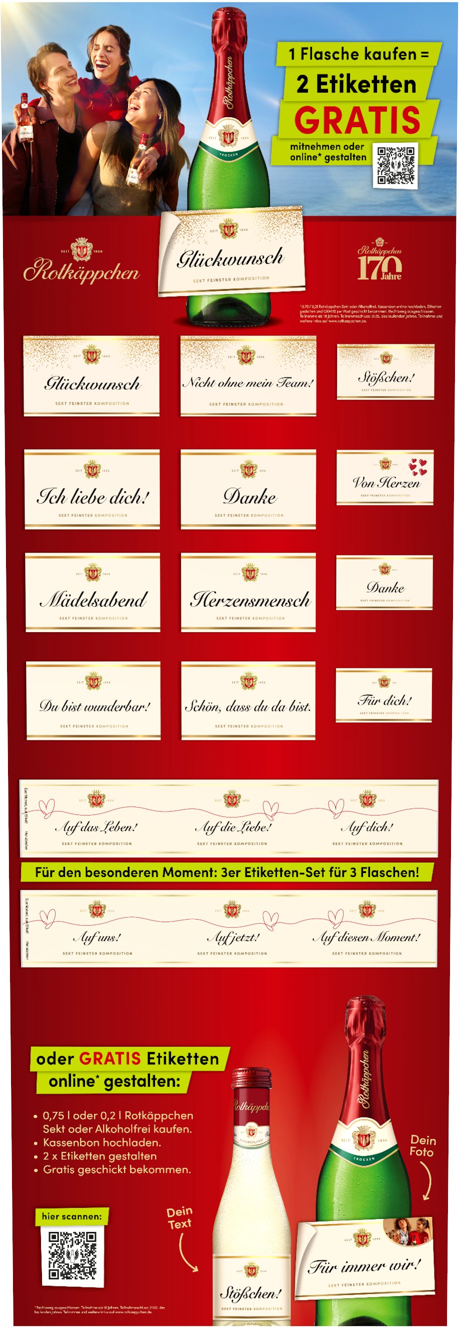 Der Weg zur persönlichen Botschaft gestaltet sich denkbar einfach: Nach dem Kauf einer Flasche Rotkäppchen Sekt oder Rotkäppchen Alkoholfrei 0,0% vol. (0,2l oder 0,75l) den Kassenbon auf www.rotkaeppchen.de hochladen. Dort gibt es vielfältige Gestaltungsmöglichkeiten für bis zu zwei einzigartige Etiketten pro Flasche zu entdecken. Einfach individuelle Botschaften formulieren (bis zu 25 Zeichen) oder aus vorgefertigten Vorschlägen auswählen. Eigene Fotos, Icons und Hintergründe lassen sich ebenfalls unkompliziert integrieren. Für alle, die mehr sagen möchten, gibt es die mehrteiligen Etiketten. So lassen sich Botschaften über mehrere Flaschen hinweg platzieren und es entsteht eine zusammenhängende Geschichte. Praktisch: Im Einzelhandel stehen in den Aufstellern Etiketten mit herzlichen Botschaften und zartem Glitzer zur sofortigen Mitnahme bereit. Die Aktion startet am 5. Januar und endet am 31. Mai 2026. Über den gesamten Kampagnenzeitraum hinweg wird die Aktion auch zielgruppengerecht auf den digitalen Rotkäppchen Kanälen verlängert.